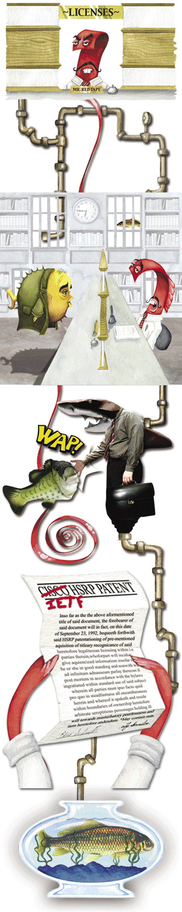 A common theme used by the comedy crew Monty Python was to emphasize and exaggerate ridiculousnesses that their target had imposed upon themselves. Few things could be considered as humorous as making a redundancy protocol... redundant; e.g. being forced to replace it by Cisco lawyers and IETF policy. We've been working a few years now on our packet filtering software pf(4) and it became time to add failover. We want to be able to set up pf firewalls side by side, and exchange the stateful information between them, so that in case of failure another could take over 'keep state' sessions. Our pfsync(4) protocol solves this problem. However, on both sides of the firewall, it is also necessary to have all the regular hosts not see a network failure. The only reliable way to do this is for both firewall machines to have and use the same IP and MAC addresses. But the only real way to do that is to use multicast protocols. The IETF community proposed work in this direction in the late 90's, however in 1997 Cisco informed them that they believed some of Cisco's patents covered the proposed IETF VRRP (Virtual Router Redundancy Protocol); on March 20, 1998 they went further and specifically named their HSRP "Hot Standby Router Protocol" patent. Reputedly, they were upset that IETF had not simply adopted the flawed HSRP protocol as the standard solution for this problem. Despite this legal pressure, the IETF community forged ahead and published VRRP as a standard even though there was a patent in the space. Why? There was much deliberation at all levels of the IETF, and unfortunately for all of us the politicians within eventually decided to allow patented technology in standards — as long as the patented technology is licensed under RAND (Reasonable And Non Discriminatory) terms. As free software programmers, we therefore find ourselves in the position that these RAND standards must not be implemented by us, and we must deviate from the standard. We find all this rather Unreasonable and Discriminatory and we *will* design competing protocols. Some standards organization, eh? Due to some HSRP flaws fixed by VRRP and for compatibility with the (HSRP-licensed) VRRP implementations of their competitors, Cisco in recent times has largely abandoned HSRP and now relies on VRRP instead — a protocol designed for and by the community, but for which they claim patent rights. On August 7 2002, after many communications, Robert Barr (Cisco's lawyer) firmly informed the OpenBSD community that Cisco would defend its patents for VRRP implementations — meaning basically that it was impossible for a free software group to produce a truly free implementation of the IETF standard protocol. Perhaps this is because Cisco and Alcatel are currently engaged in a pair of patent lawsuits; a small piece of which is Cisco attempting to use the HSRP patent against Alcatel for their use of VRRP. Some IETF working group members took note of our complaints, however an attempt in April 2003 to have the IETF abandon the use of patented technology failed to "reach consensus" in the IETF. A few years ago, the W3C, who designs our web protocols, tried to move to a RAND policy as well (primarily because of pressure from Microsoft and Apple), but the community outrage was so overpowering that they backed down. Some standards groups use this policy, while others avoid it — the one differentiation being the amount of corporate participation. In the IETF, the pro-RAND agents work for AT&T, Alcatel, IBM, Cisco, Microsoft, and other large companies. Since IETF is an open forum, they can blend in as the populace, and vote just like all others, except against the community. Translation: In failing to "reach consensus", the companies who benefit from RAND won, and the community lost again. Left with little choice, we proceeded to reinvent the wheel or, more correctly, abandon the wheel entirely and go for a "hovercraft". We designed CARP (Common Address Redundancy Protocol) to solve the same problem that these other protocols are designed for, but without the same technological basis as HSRP and VRRP. We read the patent document carefully and ensured that CARP was fundamentally different. We also avoided many of the flaws in HSRP and VRRP (such as an inherent lack of security). And since we are OpenBSD developers, we designed it to use cryptography. The combination of pf(4), pfsync(4), and carp(4) has permitted us to build highly redundant firewalls. To date, we have built a few networks that include as many as 4 firewalls, all running random reboot cycles. As long as one firewall is alive in a group, traffic through them moves smoothly and correctly for all of our packet filter functionality. Cisco's low end products are unable to do this reliably, and if they have high end products which can do this, you most certainly cannot afford them. As a final note of course, when we petitioned IANA, the IETF body regulating "official" internet protocol numbers, to give us numbers for CARP and pfsync our request was denied. Apparently we had failed to go through an official standards organization. Consequently we were forced to choose a protocol number which would not conflict with anything else of value, and decided to place CARP at IP protocol 112. We also placed pfsync at an open and unused number. We informed IANA of these decisions, but they declined to reply. This ridiculous situation then inspired one of our developers to create this parody of the well-known Monty Python skit and song. |