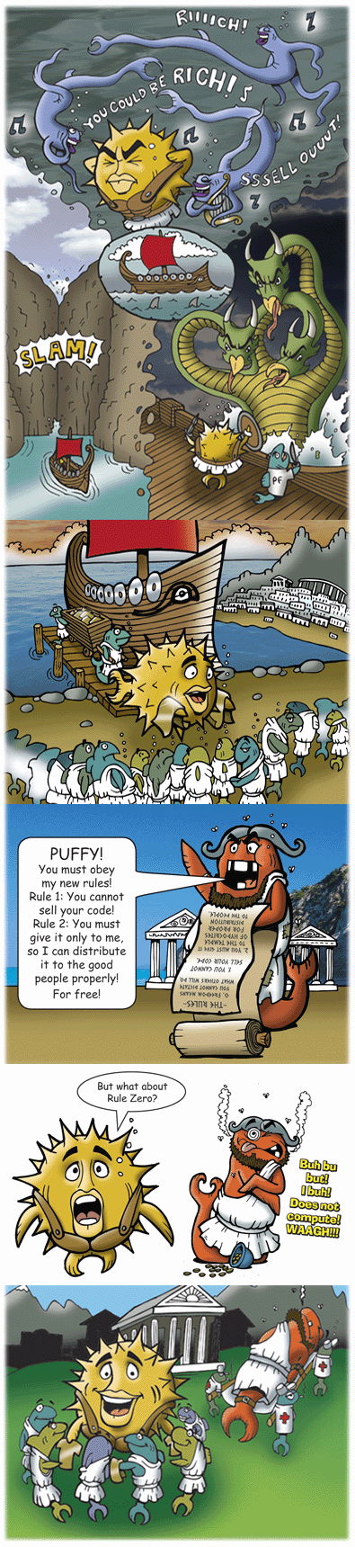 The last 10 years, every 6 month period has (without fail) resulted in an official OpenBSD release making it to the FTP servers. But CDs are also manufactured, which the project sells to continue our development goals. While tests of the release binaries are done by developers around the world, Theo and some developers from Calgary or Edmonton (such as Peter Valchev or Bob Beck) test that the discs are full of (only) correct code. Ty Semaka works for approximately two months to design and draw artwork that will fit the designated theme, and coordinates with his music buddies to write and record a song that also matches the theme. Then the discs and all the artwork gets delivered to the plant, so that they can be pressed in time for an official release date. This release, instead of bemoaning vendors or organizations that try to make our task of writing free software more difficult, we instead celebrate the 10 years that we have been given (so far) to write free software, express our themes in art, and the 5 years that we have made music with a group of talented musicians. OpenBSD developers have been torturing each other for years now with Humppa-style music, so this release our users get a taste of this too. Sometimes at hackathons you will hear the same songs being played on multiple laptops, out of sync. It is under such duress that much of our code gets written. We feel like Pufferix and Bobilix delivering The Three Discs of Freedom to those who want them whenever the need arises, then returning to celebrate the (unlocked) source tree with all the other developers. |